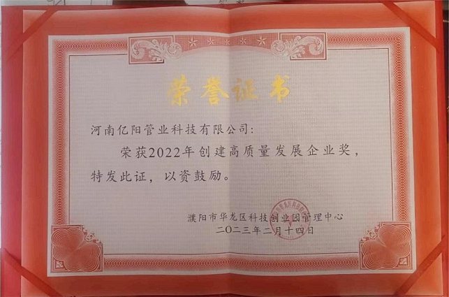 喜訊:河南億陽管業(yè)科技有限公司榮獲“2022年創(chuàng)建高質(zhì)量發(fā)展企業(yè)”榮譽稱號