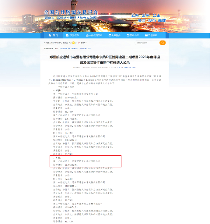 喜報(bào):河南億陽管業(yè)科技有限公司成功中標(biāo)“鄭州航空港城市運(yùn)營有限公司集中供熱D區(qū)管網(wǎng)建設(shè)二期項(xiàng)目2023年度保溫管及保溫管件采購項(xiàng)目”