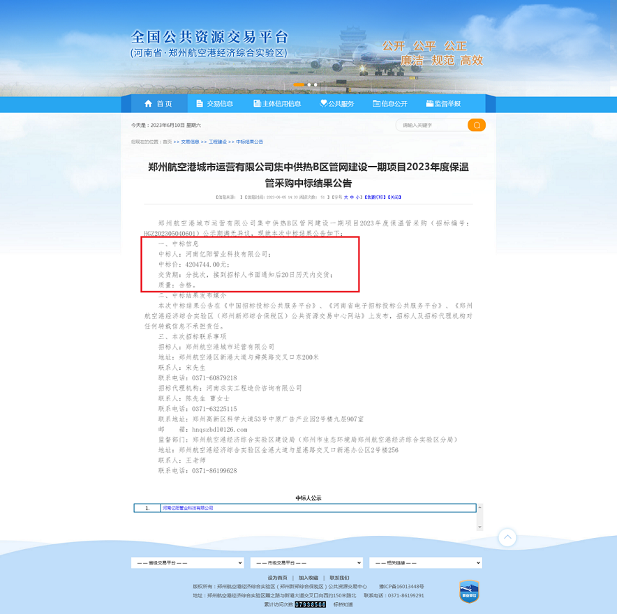 喜報:河南億陽管業(yè)科技有限公司成功中標“鄭州航空港城市運營有限公司集中供熱B區(qū)管網(wǎng)建設(shè)一期項目2023年度保溫管采購項目”網(wǎng)建設(shè)一期項目2023年度保溫管采購項目”
