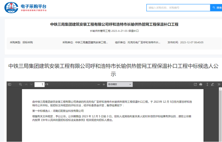 喜報(bào):河南億陽(yáng)管業(yè)科技有限公司成功中標(biāo)“中鐵三局集團(tuán)建筑安裝工程有限公司呼和浩特市長(zhǎng)輸供熱網(wǎng)管工程保溫補(bǔ)口工程”